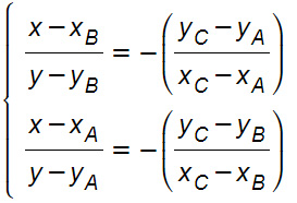 dove A, B, C sono i tre vertici del triangolo. In questo sistema di equazioni le incognite da individuare sono x e y, ovvero ascissa e ordinata dell’ortocentro del triangolo.