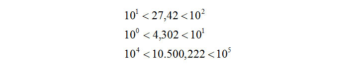 Che cosa significa questo? Che qualsiasi numero, anche se ha una parte decimale, è sempre compreso tra 10 elevato a qualcosa e 10 elevato allo stesso numero aumentato di 1. Facciamo qualche esempio per essere più chiari.
